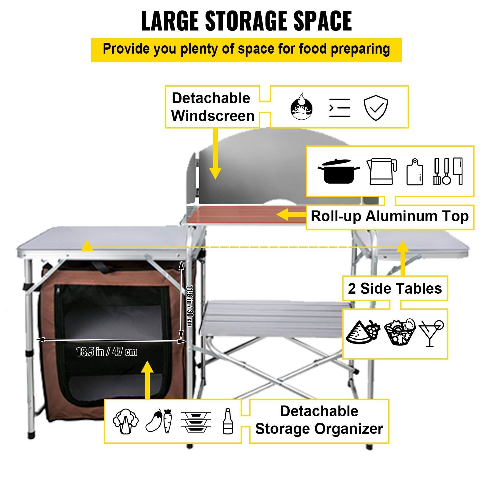 1.Spacious Storage Space: The camp kitchen table comes with a roll-up aluminum tabletop, a windshield and 2 side tables, holding your grills, cooking tools, condiments, and other supplies. The 2-tier detachable storage organizer provides you with extensive space to place utensils in order.