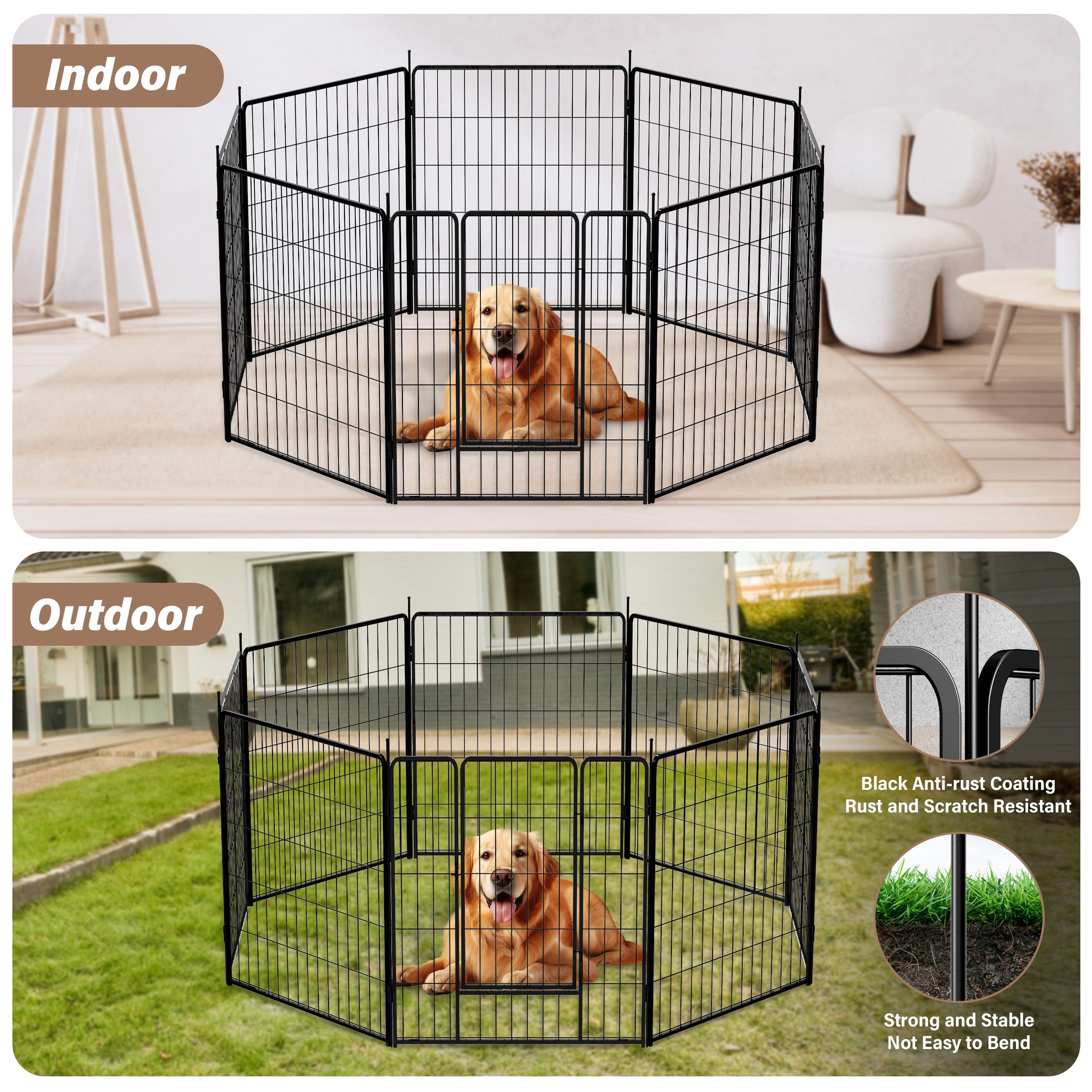 [Iron Fence] The 8 panel dog playpen indoor fence for dogs is made of iron with black anti-rust coating. The metal playpen is free-standing, however, if you have a naughty puppy, you might secure the playpen to the ground firmly for double safety.