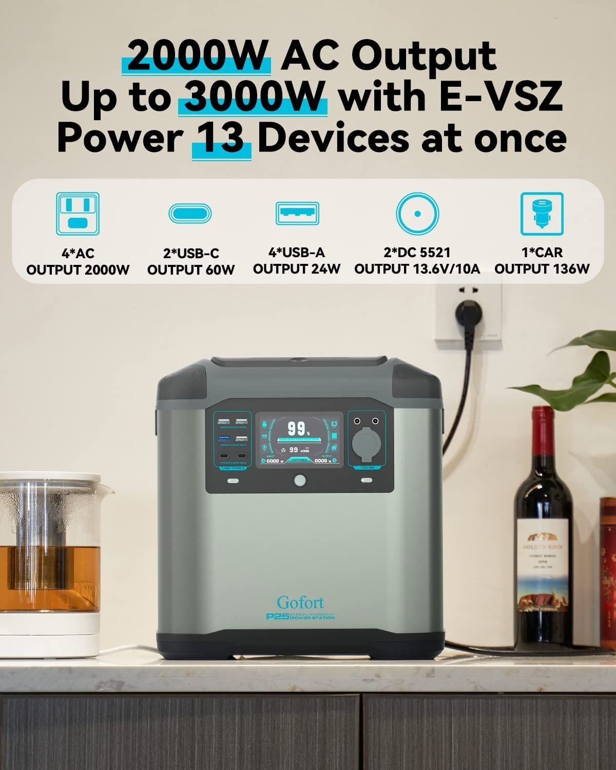 3.[1573Wh/2000W & 13 Charging Outputs]: Gofort P25 solar generator featured with a wide range of output options, including 4 x pure sine wave AC outlets, 2 x 60W USB-C ports, 2x DC ports, 1 x QC3.0 port, power all your appliances with 2000W output, that's on par with outdoor generators without the fumes or noise. With 13 outlets and its huge output, you can power 90% of your appliances.