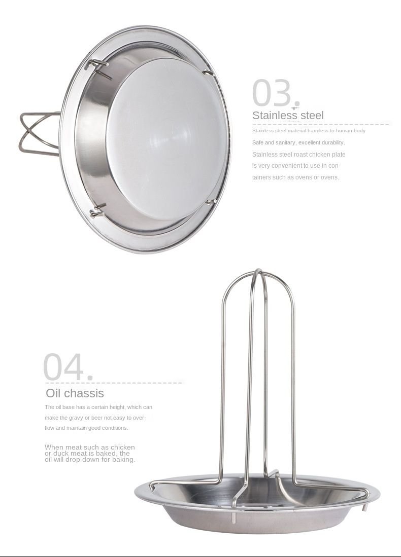 Use: Roast chicken tray is used for baking and supporting roast chicken in light-wave ovens and hot ovens, and the chassis is used to put auxiliary materials and play a smoky effect inside the chicken in order to achieve better taste.