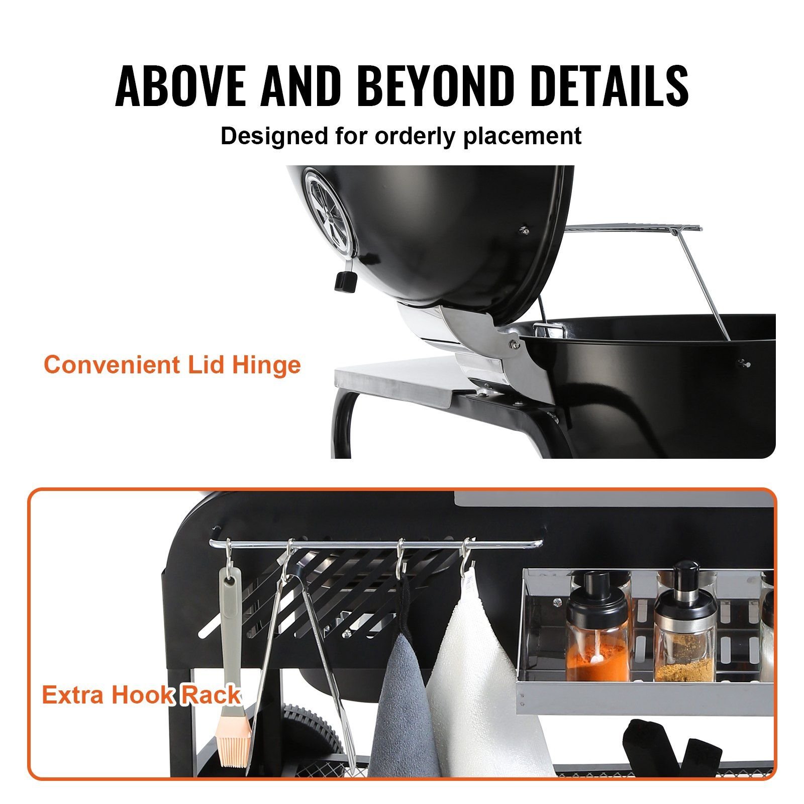 4.Orderly Placement: The hassle of outdoor cooking is no longer a challenge! With lid hinge and hooks, you can avoid placing the lid on the ground, and hang your barbecue tools close at hand.